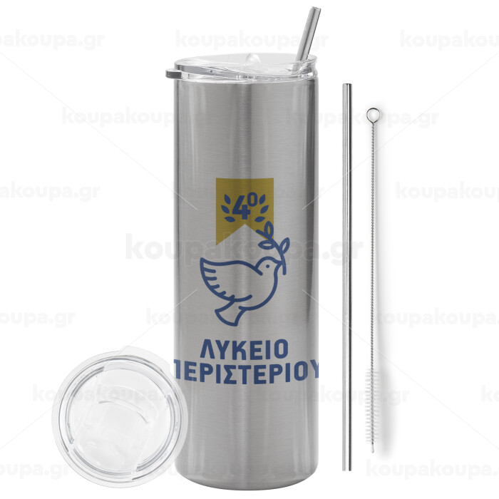 Έμβλημα Σχολικό μπλε/χρυσό περιστέρι, Tumbler stainless steel Silver 600ml, with metal straw & cleaning brush