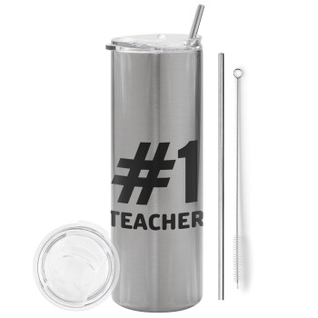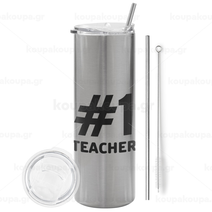 #1 teacher, Tumbler stainless steel Silver 600ml, with metal straw & cleaning brush