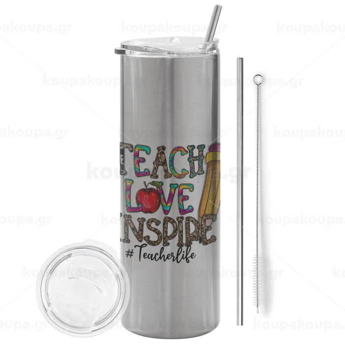 Teach, Love, Inspire, Tumbler stainless steel Silver 600ml, with metal straw & cleaning brush