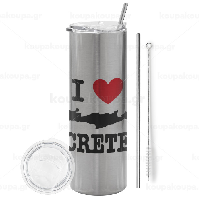 I Love Crete, Tumbler stainless steel Silver 600ml, with metal straw & cleaning brush