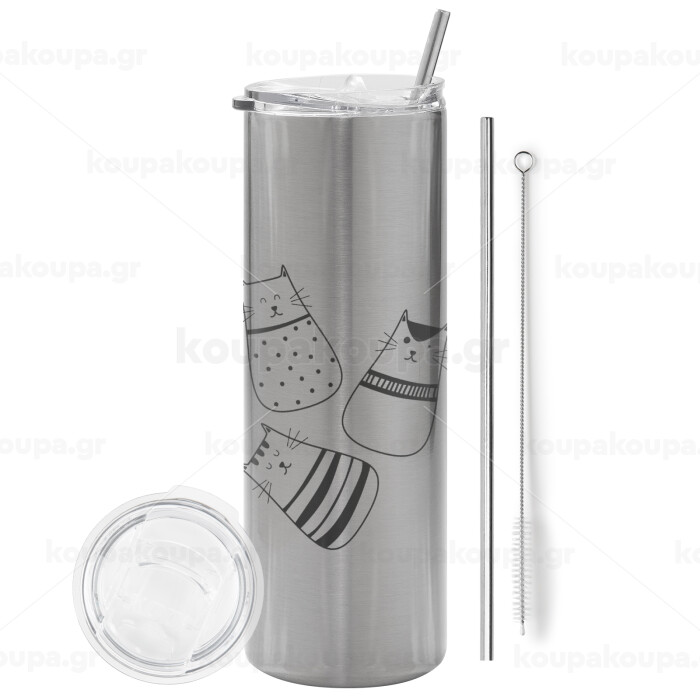 Cute cats, Tumbler stainless steel Silver 600ml, with metal straw & cleaning brush
