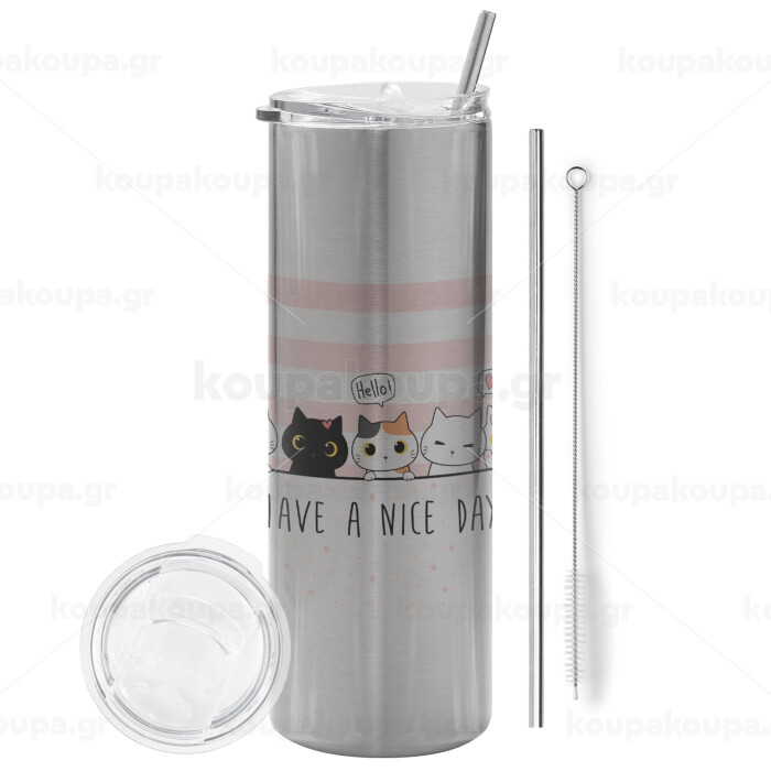 Have a nice day cats, Tumbler stainless steel Silver 600ml, with metal straw & cleaning brush