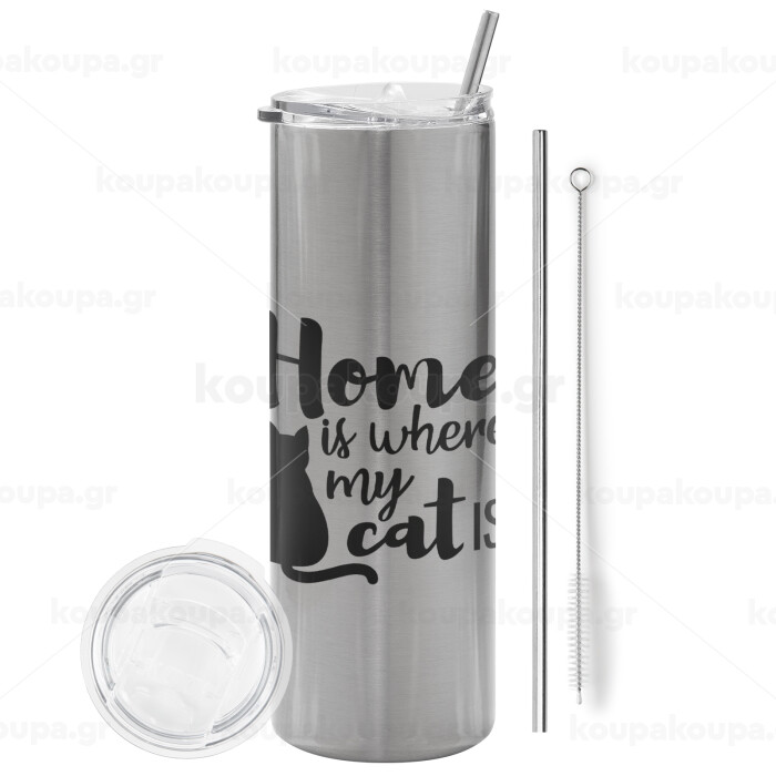 Home is where my cat is!, Tumbler stainless steel Silver 600ml, with metal straw & cleaning brush