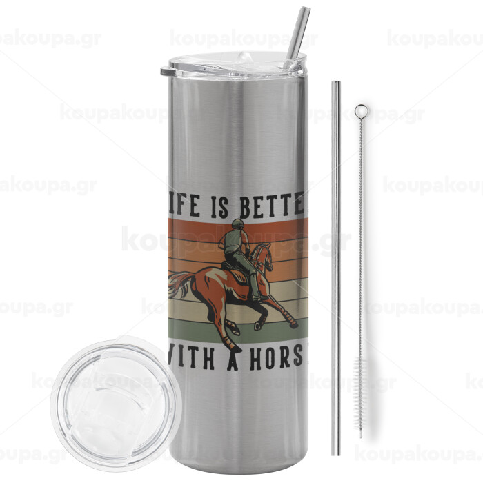 Life is Better with a Horse, Tumbler stainless steel Silver 600ml, with metal straw & cleaning brush