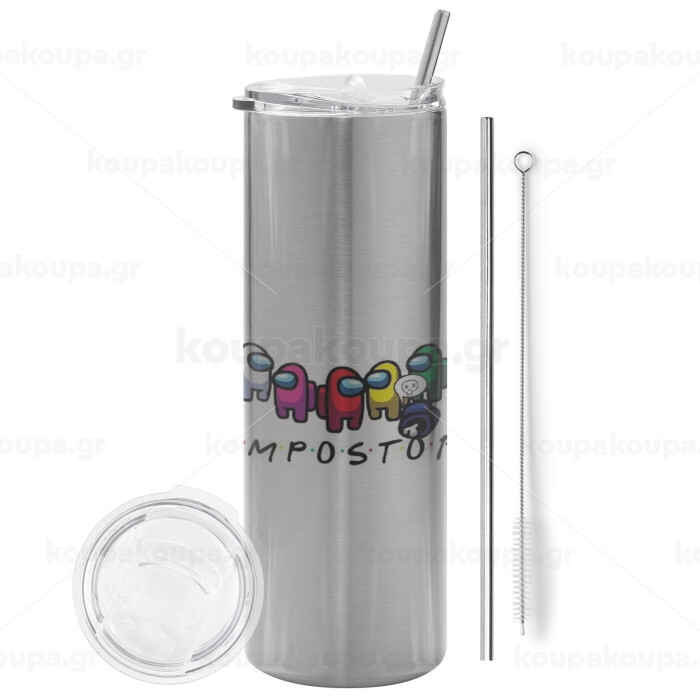 Among US impostor, Tumbler stainless steel Silver 600ml, with metal straw & cleaning brush