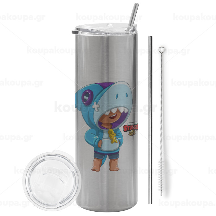 Brawl Stars Leon Shark, Tumbler stainless steel Silver 600ml, with metal straw & cleaning brush
