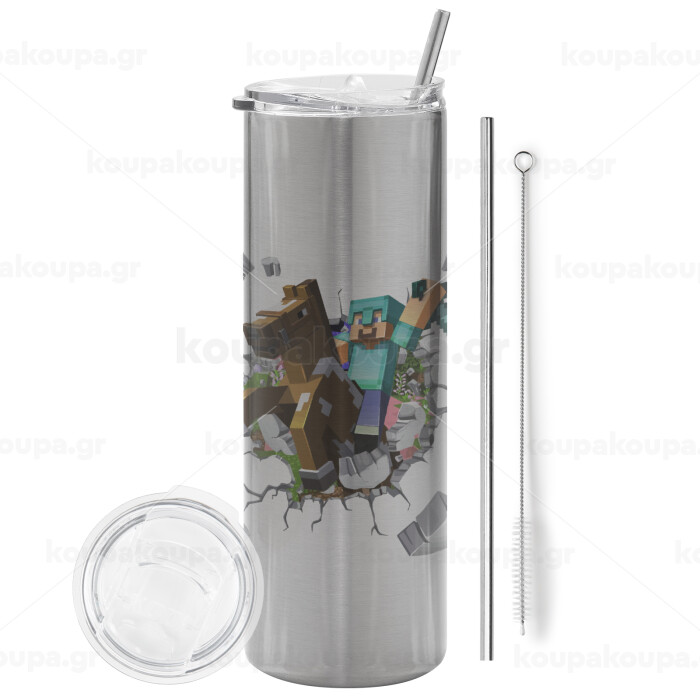Minecraft brick, Tumbler stainless steel Silver 600ml, with metal straw & cleaning brush