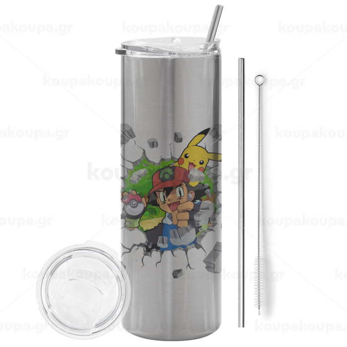 Pokemon brick, Tumbler stainless steel Silver 600ml, with metal straw & cleaning brush