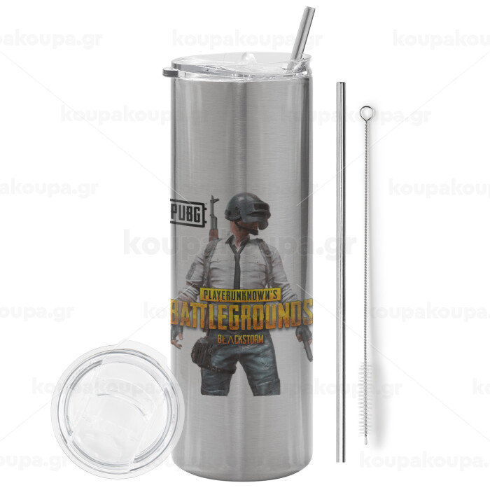 PUBG battleground royale, Tumbler stainless steel Silver 600ml, with metal straw & cleaning brush