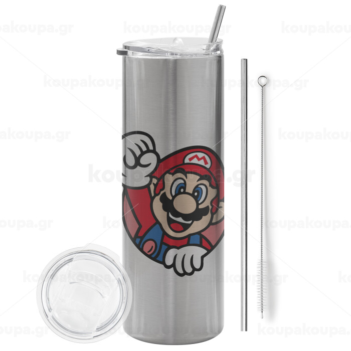 Super mario win, Tumbler stainless steel Silver 600ml, with metal straw & cleaning brush