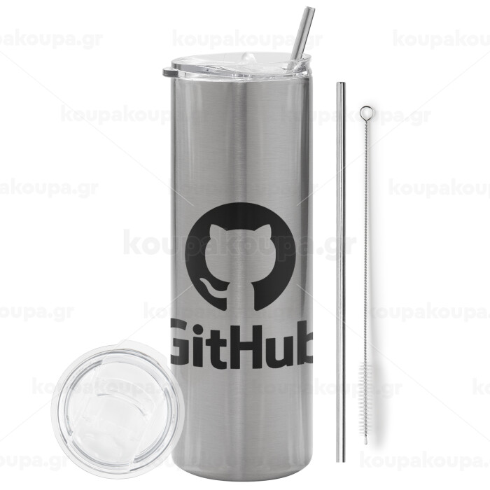 GitHub, Tumbler stainless steel Silver 600ml, with metal straw & cleaning brush