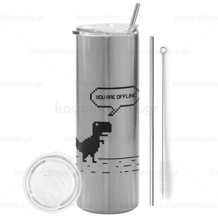 You are offline dinosaur, Tumbler stainless steel Silver 600ml, with metal straw & cleaning brush