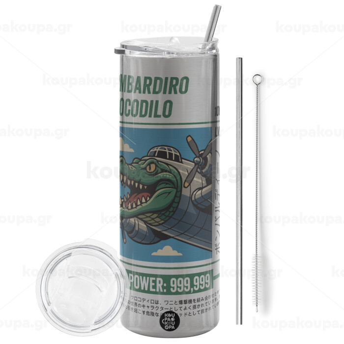 Bombardiro Crocodilo, Tumbler stainless steel Silver 600ml, with metal straw & cleaning brush