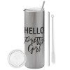 Hello pretty girl, Tumbler stainless steel Silver 600ml, with metal straw & cleaning brush