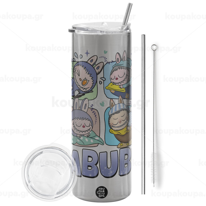 Labubu, Tumbler stainless steel Silver 600ml, with metal straw & cleaning brush