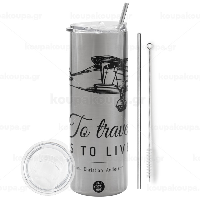 To travel is to live, Tumbler stainless steel Silver 600ml, with metal straw & cleaning brush