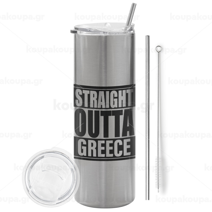 Straight Outta greece, Tumbler stainless steel Silver 600ml, with metal straw & cleaning brush