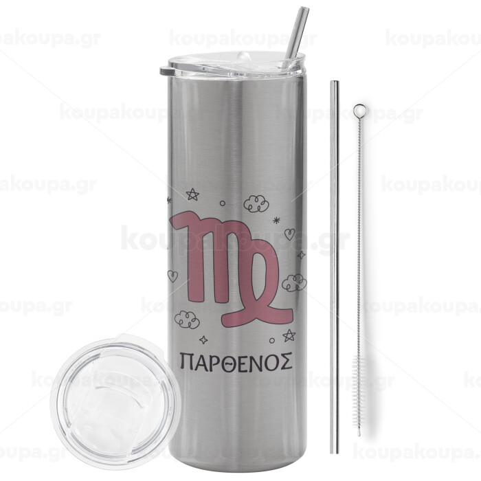 Ζώδια Παρθένος, Tumbler stainless steel Silver 600ml, with metal straw & cleaning brush