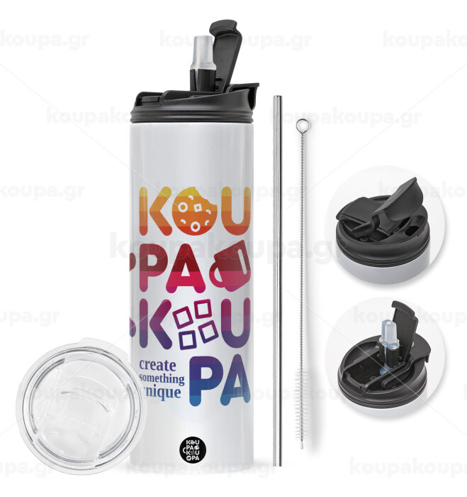 koupakoupa, Travel Tumbler 2 Lids, with metal straw & cleaning brush (Stainless steel 304 Food grade, BPA free, 600ml)