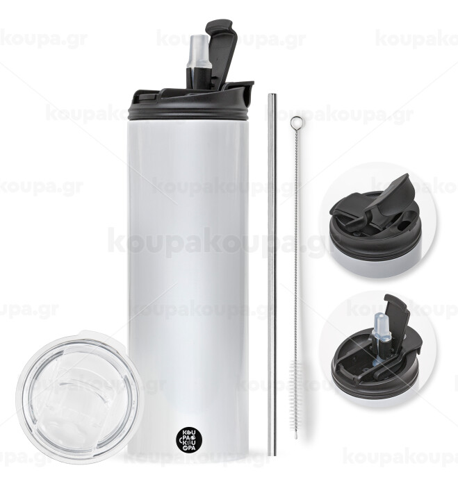 BLANK, Travel Tumbler 2 Lids, with metal straw & cleaning brush (Stainless steel 304 Food grade, BPA free, 600ml)