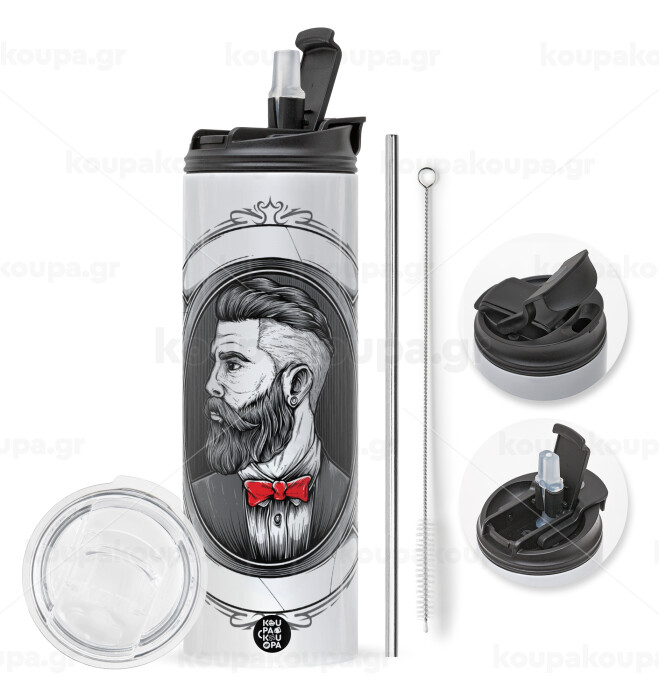 Barber shop, Travel Tumbler 2 Lids, with metal straw & cleaning brush (Stainless steel 304 Food grade, BPA free, 600ml)