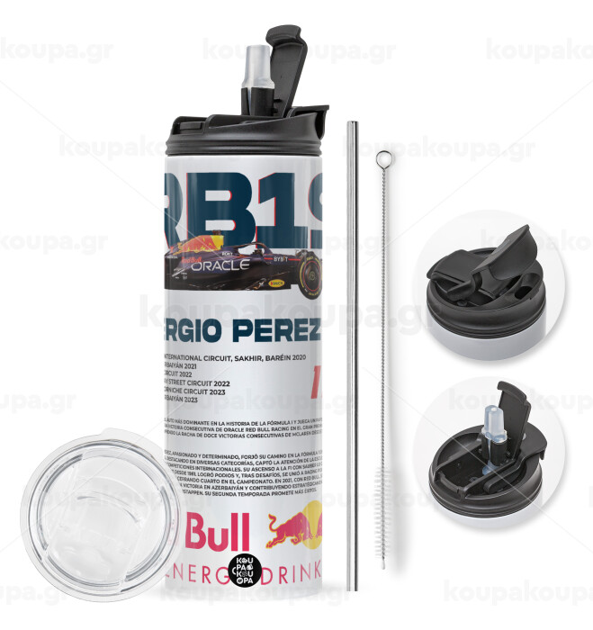 Redbull Sergio Perezi, Travel Tumbler 2 Lids, with metal straw & cleaning brush (Stainless steel 304 Food grade, BPA free, 600ml)