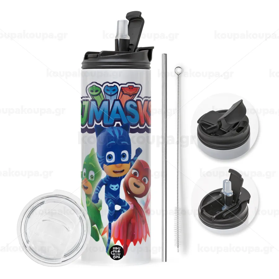PJ masks, Travel Tumbler 2 Lids, with metal straw & cleaning brush (Stainless steel 304 Food grade, BPA free, 600ml)