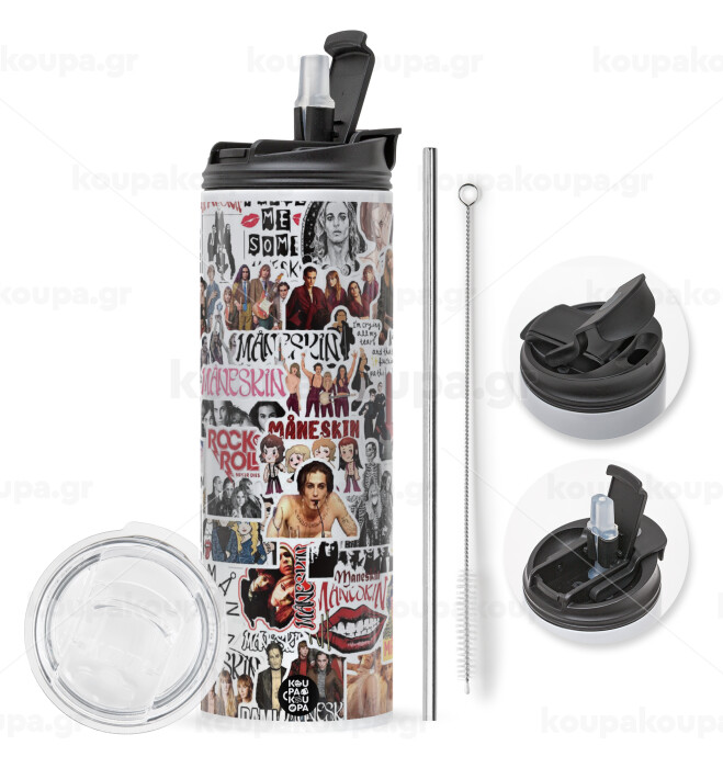 Maneskin stickers, Travel Tumbler 2 Lids, with metal straw & cleaning brush (Stainless steel 304 Food grade, BPA free, 600ml)