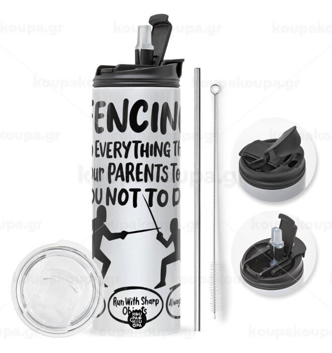 Fencing, do everything that your parents told you not to do., Travel Tumbler 2 Lids, with metal straw & cleaning brush (Stainless steel 304 Food grade, BPA free, 600ml)