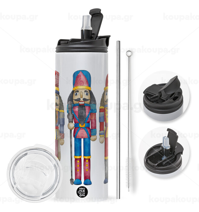 Christmas Nutcrackers, Travel Tumbler 2 Lids, with metal straw & cleaning brush (Stainless steel 304 Food grade, BPA free, 600ml)