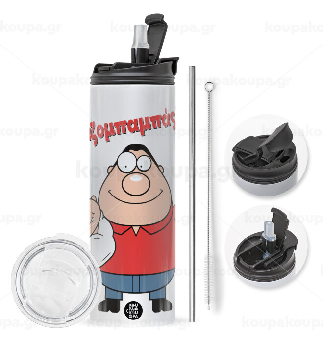 Χαζομπαμπάς, Travel Tumbler 2 Lids, with metal straw & cleaning brush (Stainless steel 304 Food grade, BPA free, 600ml)