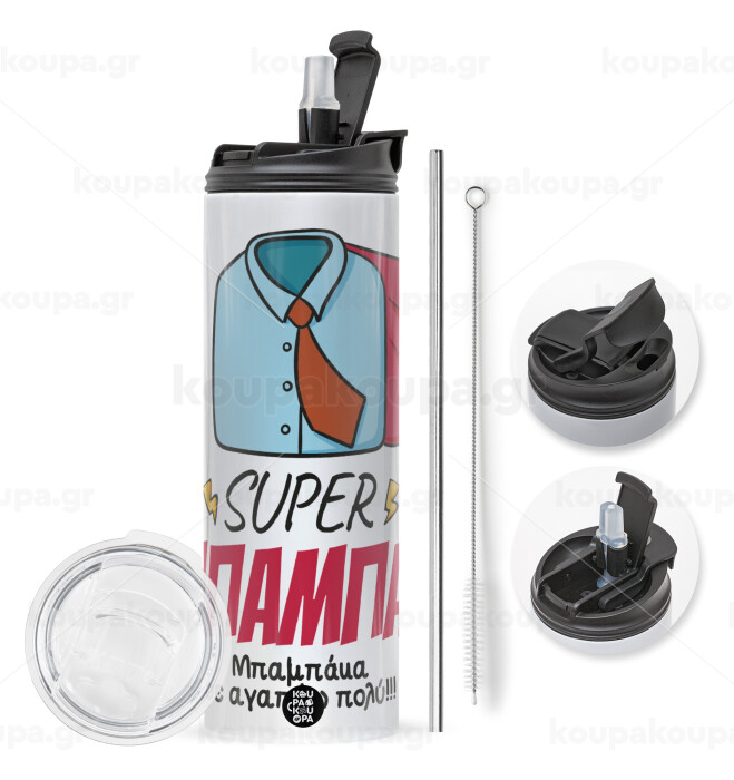 SUPER ΜΠΑΜΠΑΣ, Travel Tumbler 2 Lids, with metal straw & cleaning brush (Stainless steel 304 Food grade, BPA free, 600ml)