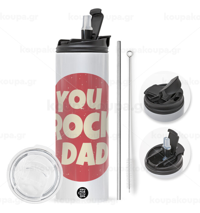 YOU ROCK DAD, Travel Tumbler 2 Lids, with metal straw & cleaning brush (Stainless steel 304 Food grade, BPA free, 600ml)