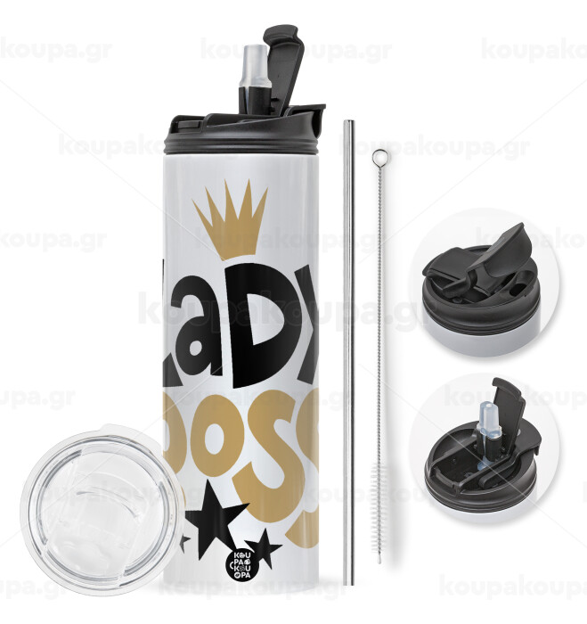 Lady Boss, Travel Tumbler 2 Lids, with metal straw & cleaning brush (Stainless steel 304 Food grade, BPA free, 600ml)