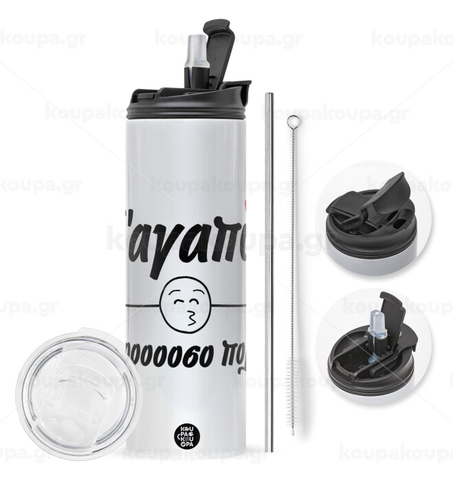 Σ΄ αγαπώ τόοοοοοσο πολύ!!!, Travel Tumbler 2 Lids, with metal straw & cleaning brush (Stainless steel 304 Food grade, BPA free, 600ml)