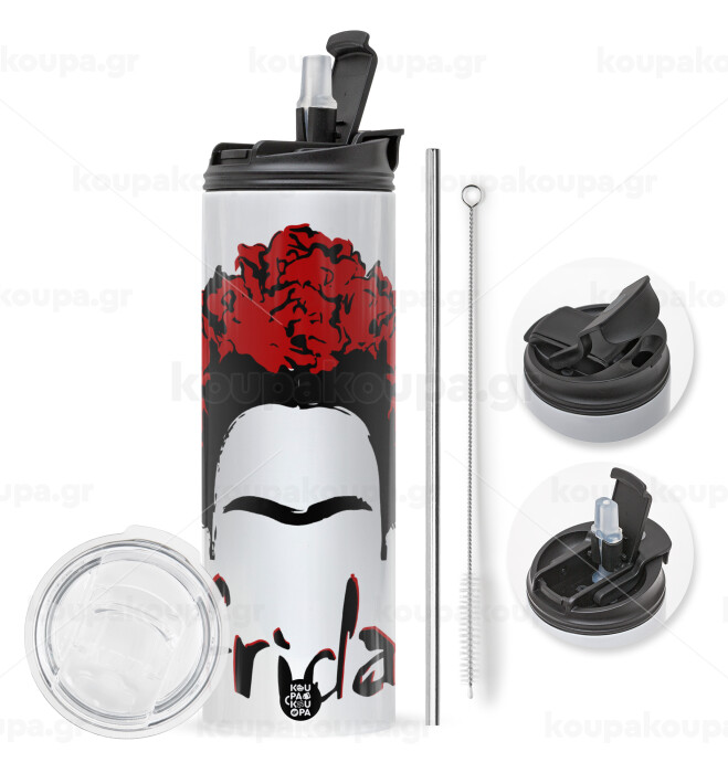 Frida, Travel Tumbler 2 Lids, with metal straw & cleaning brush (Stainless steel 304 Food grade, BPA free, 600ml)