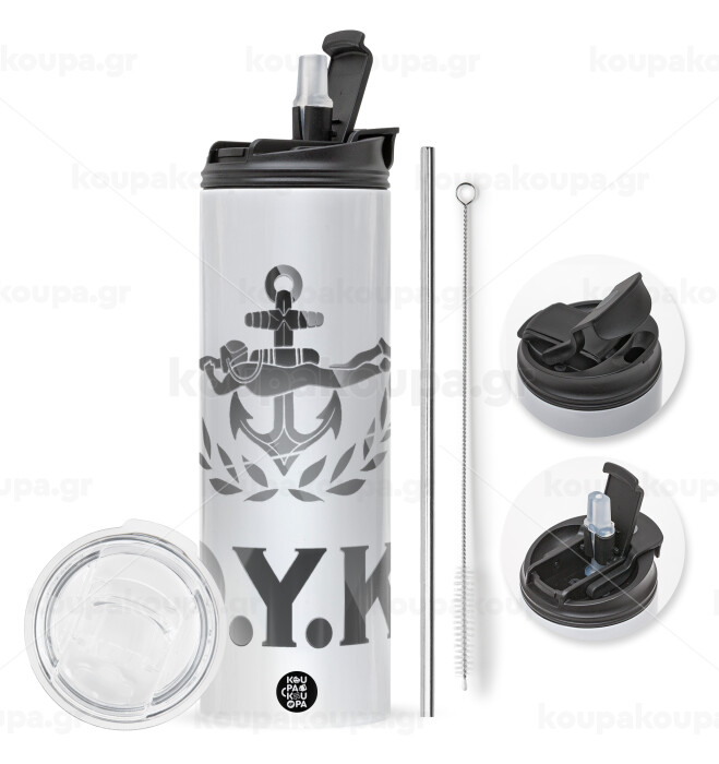 Ο.Υ.Κ., Travel Tumbler 2 Lids, with metal straw & cleaning brush (Stainless steel 304 Food grade, BPA free, 600ml)