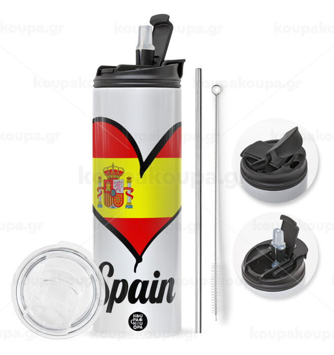 Spain flag, Travel Tumbler 2 Lids, with metal straw & cleaning brush (Stainless steel 304 Food grade, BPA free, 600ml)