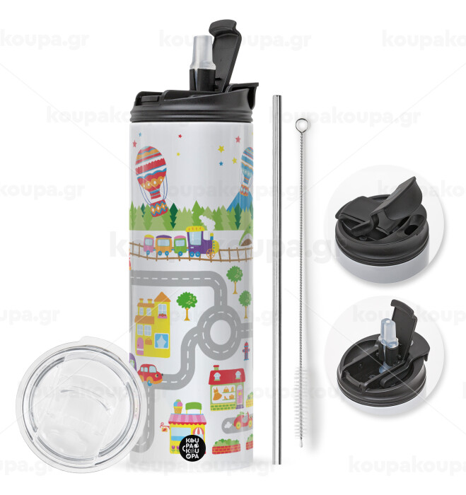 City road track maps, Travel Tumbler 2 Lids, with metal straw & cleaning brush (Stainless steel 304 Food grade, BPA free, 600ml)