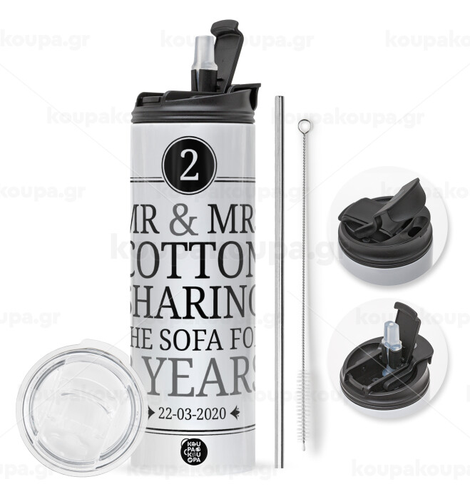 Mr & Mrs Sharing the sofa, Travel Tumbler 2 Lids, with metal straw & cleaning brush (Stainless steel 304 Food grade, BPA free, 600ml)