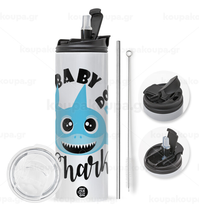 Baby Shark (boy), Travel Tumbler 2 Lids, with metal straw & cleaning brush (Stainless steel 304 Food grade, BPA free, 600ml)