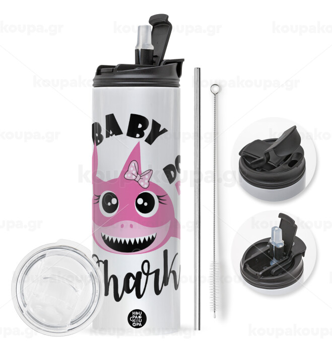 Baby Shark (girl), Travel Tumbler 2 Lids, with metal straw & cleaning brush (Stainless steel 304 Food grade, BPA free, 600ml)