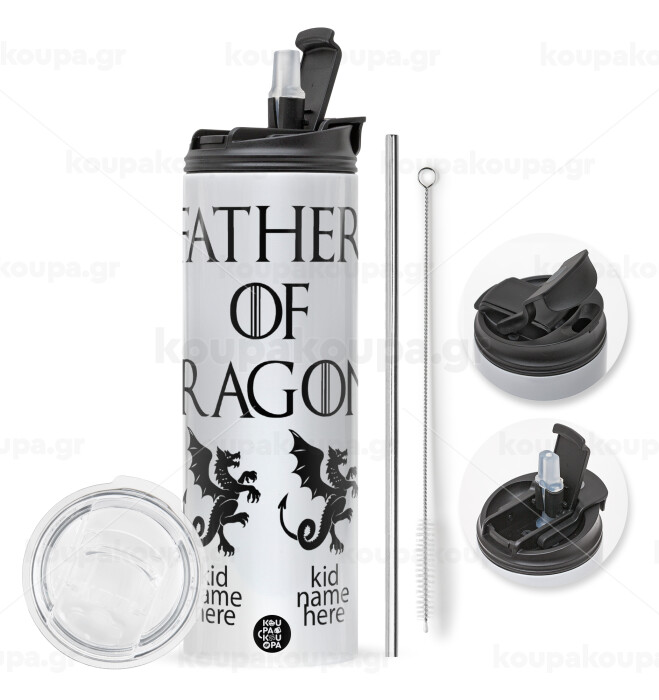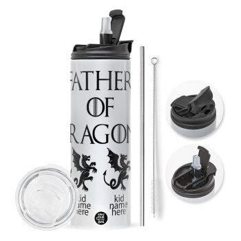 GOT, Father of Dragons (με ονόματα παιδικά), Travel Tumbler 2 Lids, with metal straw & cleaning brush (Stainless steel 304 Food grade, BPA free, 600ml)