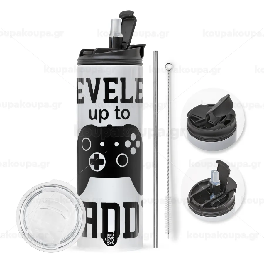 Leveled to Daddy, Travel Tumbler 2 Lids, with metal straw & cleaning brush (Stainless steel 304 Food grade, BPA free, 600ml)
