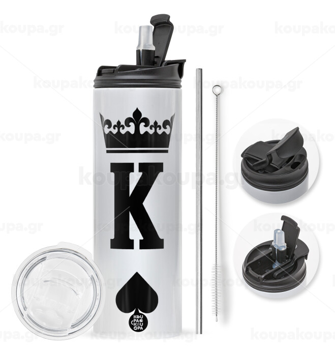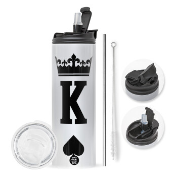 King, Travel Tumbler 2 Lids, with metal straw & cleaning brush (Stainless steel 304 Food grade, BPA free, 600ml)