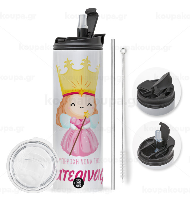 Η νονά μου, πριγκίπισσα, Travel Tumbler 2 Lids, with metal straw & cleaning brush (Stainless steel 304 Food grade, BPA free, 600ml)