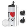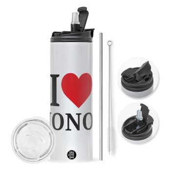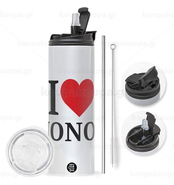 I Love ΝΟΝΟΣ, Travel Tumbler 2 Lids, with metal straw & cleaning brush (Stainless steel 304 Food grade, BPA free, 600ml)