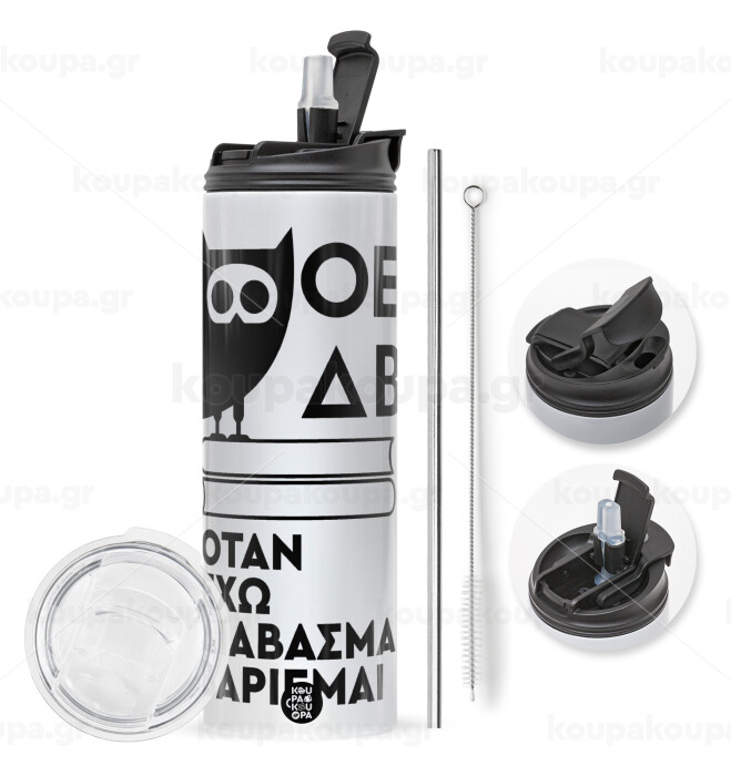 ΟΕΔΒ, Travel Tumbler 2 Lids, with metal straw & cleaning brush (Stainless steel 304 Food grade, BPA free, 600ml)