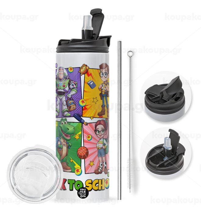 Back to the School Buzz & Friends, Travel Tumbler 2 Lids, with metal straw & cleaning brush (Stainless steel 304 Food grade, BPA free, 600ml)