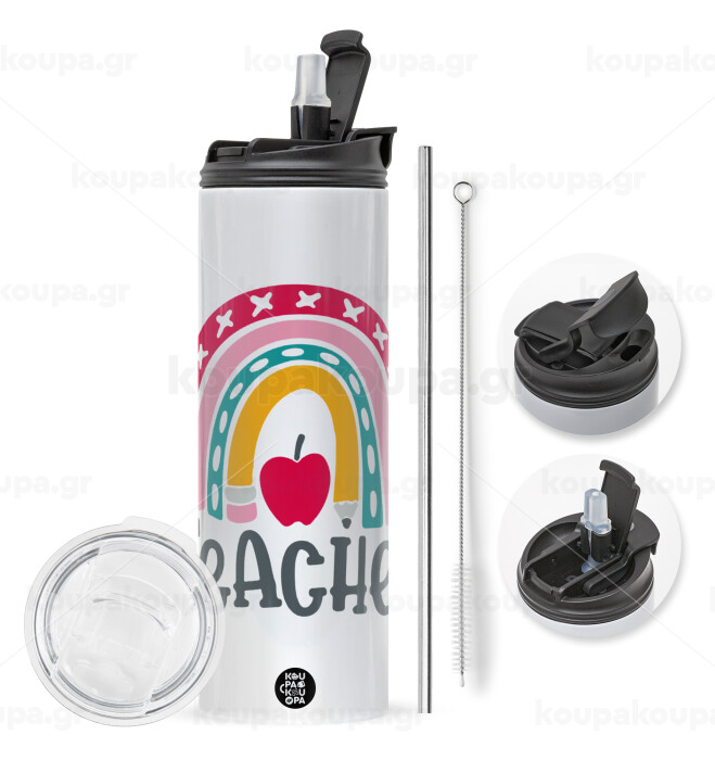 Rainbow teacher, Travel Tumbler 2 Lids, with metal straw & cleaning brush (Stainless steel 304 Food grade, BPA free, 600ml)